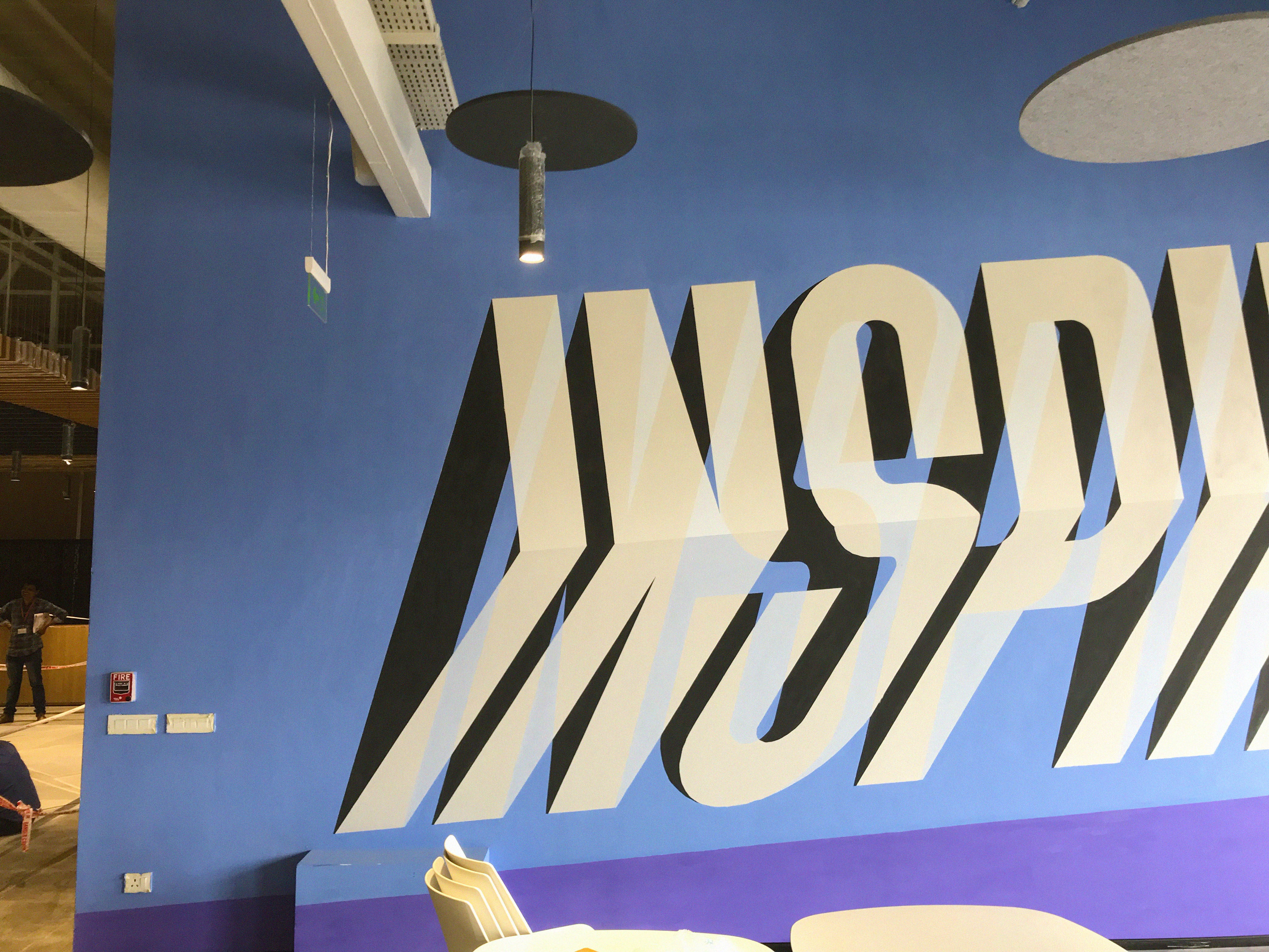 The typographic mural INSPIRE was hand painted on the first site. The chosen colour palette responds to HP's branding and visual treatment.